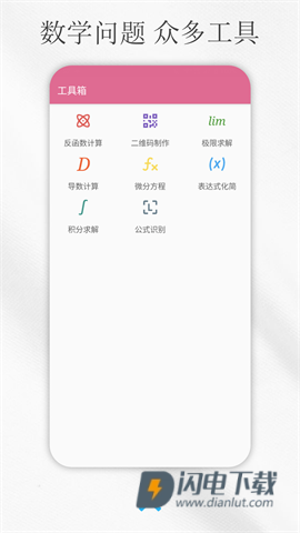 4、如果需要更多功能,可以点击主页右下角的+号,进入工具箱。除了求解方程外,积分、导数、极限以及微分方程等都会一一呈现,绝对不让你感到冷场!