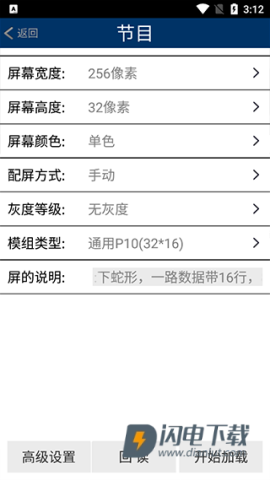 1、点击配置,设置显示屏参数,选定相应模组后开始加载,若需调试数据极性等选项,请进入高级设置。