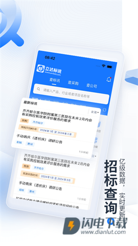 立达标讯app是一款专为招投标行业人士打造的工具,原名今日招标网。该软件能够快捷高效地查询招标信息,涵盖多个领域,如医疗、环保和商业服务等,为用户提供了极大的便利,提升了投标成功的机会。无论你是采购商还是供应商,立达标讯都能满足你的需求,快来下载试试吧!