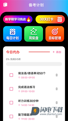 4、另外,软件支持制定备考计划和个人学习方案,配合生词本、薄弱点分析和错题统计功能,能够帮助用户更有针对性地安排复习内容,适合长期积累和阶段性强化使用。