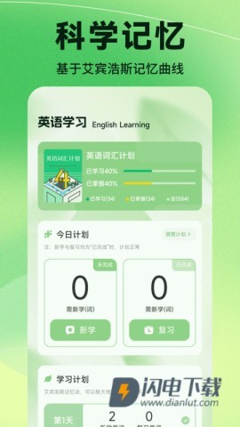 1、安装app后进入计划页面,就可以先给自己设定单词背诵任务,按照个人节奏来安排学习进度。
