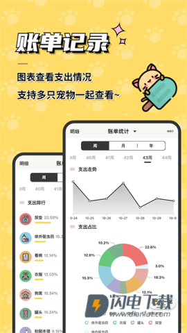 3、账单系统很有存在感,不管是猫粮、狗粮、零食、玩具、服饰还是医疗支出,都能清清楚楚记进去,后面看统计图的时候特别有冲击力。