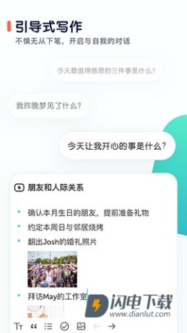 1、格志日记和常见的记事本类软件不太一样,它更像是一个有引导的日记系统。对于刚开始写日记的人来说,最大的问题往往不是不会写,而是不知道写什么。