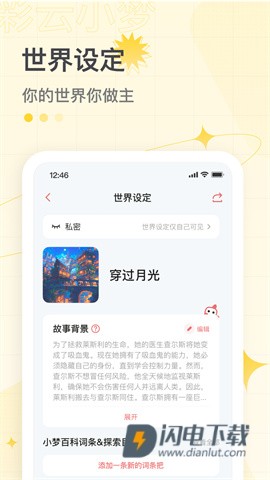 2、如果你更偏向小说创作,这款软件的世界设定功能也很实用。它支持创建普通词条、人物词条和人物关系,还能补充背景故事,让后续续写更贴近你想要的方向。